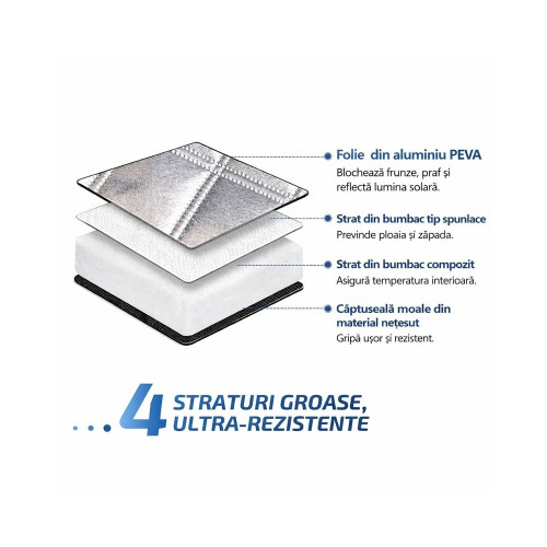 - Strat exterior: folie din aluminiu PEVA, reflecta lumina solara si reduce incalzirea