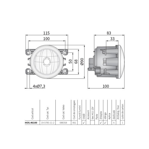 Proiector ceata FI90 HO5 compatibil Dacia Logan, Sandero,Duster Cod: 46100